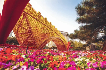 近日,一座橫架在北京東單的金色大橋吸引了來往行人的注意。這座由藝術(shù)家舒勇創(chuàng)作的大型景觀雕塑《絲路金橋》全長28米、高6米、寬4米,成為國慶67周年天安門及長安街沿線主題景觀布置中的一個重要組成部分。