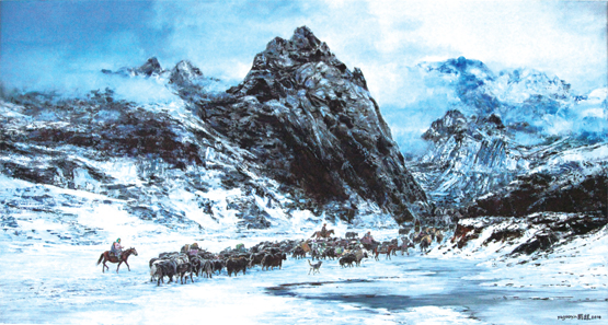 如果說蔚國銀的肖像畫、人體畫、靜物畫是屬于寫實風(fēng)格,那么他的風(fēng)景畫無疑屬于寫意風(fēng)格?!洞旱诫]原》以帶有表現(xiàn)意味的筆法刻畫西北高原大地,重點描繪隴原風(fēng)光的結(jié)構(gòu)感與堅實感,給人以雄強(qiáng)、陽剛的藝術(shù)美感;《隴原冬雪》《過年》給觀者以雄偉、蒼茫、渾厚、廣闊、無垠的意境,刀與筆的合力形成了充滿力度的大氣磅礴之勢;《老子出關(guān)》描畫老子騎牛穿行于云山霧氣之間,充滿東方意趣,此畫將中國山水畫的意境、韻味挪用到油畫創(chuàng)作之中,油畫的筆觸、肌理、質(zhì)感與中國畫的用筆、皴法、陰陽相互融會,其用筆勁爽、奔放,其中的開合、虛實、遠(yuǎn)近、疾緩與中國的山水畫如出一轍,凸現(xiàn)了藝術(shù)家打通中西、吞吐古今的藝術(shù)理念;《遷徙》是一幅160×300cm的鴻篇巨制,天空云霧彌漫,高山崇峻屹立,風(fēng)雪、云氣縈繞其中,給人以險峻、崇高、壯麗的美感,其用筆渾深堅偉,意境邈遠(yuǎn)升騰,無論在經(jīng)營位置還是在骨法用筆上都借鑒了中國畫的表現(xiàn)方法,尤其是巍峨高聳的群山之下那一群渺小的遷徙馬隊與牛群,符合中國畫“丈山尺樹、寸馬豆人”的審美規(guī)范。