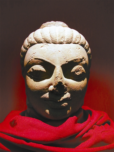 展覽中的這尊阿育王像頭部有高大的肉髻,發(fā)髻作起伏的圓丘狀和翻轉(zhuǎn)的云紋狀,高鼻深目,頭部最顯著的特征是自鼻孔下向兩側(cè)生長的小胡子。在印度造像展廳中有一尊來自于北方邦馬圖拉的5世紀(jì)佛頭(圖4),也表現(xiàn)有相同的小胡子,這是印度人典型特征之一,據(jù)此可知兩者之間應(yīng)存在某種內(nèi)在關(guān)聯(lián)。這尊阿育王像著通肩式袈裟,袈裟衣紋表現(xiàn)為凸起的尖棱線狀,與同地區(qū)出土的著褒衣博帶式袈裟佛像存在明顯差異。袈裟胸部衣紋和腹部以下衣紋各自成組,均為同心的U字形自小而大的擴散。這種衣紋線的空間構(gòu)成關(guān)系,與前述的馬圖拉佛立像有一定的相似之處,只是后者胸腹部及以下衣紋并未分為兩組表現(xiàn)。