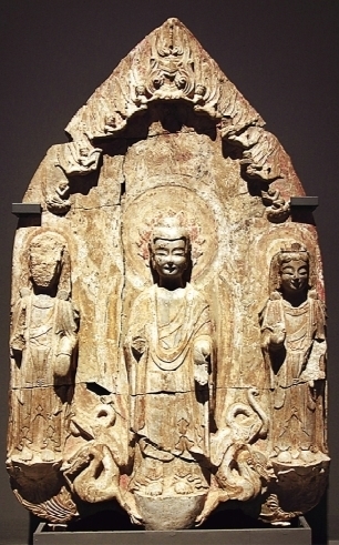 青州龍興寺遺址出土東魏背屏式造像(圖1),由一佛二菩薩組成,主尊佛立像跣足立于蓮臺(tái)上,兩側(cè)各有一條尾巴朝上的龍,兩龍嘴均銜著蓮枝,蓮枝前端又生出水流,水中化生出蓮臺(tái),其上站立著脅侍菩薩。在桃尖形背屏的上端,左右各表現(xiàn)有三身飛天,上面兩飛天共同手托佛塔,其他飛天則手持樂(lè)器。在飛天下方、菩薩頭頂部位各有一尊從天而降的蓮花化生童子,均作禮拜狀。主尊佛立像背后的背屏上還彩繪有背光(背光包括頭光和身光)。如此多佛教元素雕刻在一起絲毫不顯得凌亂,完全得益于均衡的對(duì)稱構(gòu)圖和主次分明的空間組合。背屏中的佛塔,是佛法的體現(xiàn),伎樂(lè)飛天,是為供養(yǎng)和禮贊佛陀而來(lái)。龍是水神,水中化生出來(lái)的蓮花則是佛國(guó)潔凈世界的象征。這些不可思議并滿含宗教情懷的造型,共同傳達(dá)出信眾心目中佛國(guó)世界的美好圖景。不過(guò),最值得注意的還是主尊佛立像和脅侍菩薩的表現(xiàn),尤其是他們那微睜的雙目和上翹的嘴角,不僅凝聚了古代匠師們高超的雕刻技巧,還傳達(dá)了佛陀在宣講佛法時(shí)發(fā)自內(nèi)心的喜悅。