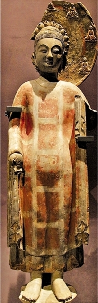 相對(duì)前一尊造像而言,青州龍興寺遺址出土北齊佛立像(圖2)則要簡(jiǎn)潔得多。這是一尊單體的圓雕佛像,沒(méi)有背屏和脅侍菩薩。東魏佛造像是在北魏晚期實(shí)例基礎(chǔ)上的繼續(xù)發(fā)展,那種背屏式造像,其實(shí)是對(duì)此前石窟造像的模仿。在東魏時(shí)期,背屏式造像中的佛像軀體逐漸變得厚實(shí)起來(lái)。大約在進(jìn)入北齊后,佛像脫離背屏而變成圓雕佛像。這尊北齊佛立像跣足立于蓮臺(tái)山,低肉髻,有細(xì)密的螺發(fā),面相豐圓,雙目微睜,嘴角上翹,左手殘缺,右手手指也被破壞,似乎在施與愿印。佛像著通肩式袈裟,袈裟表面畫有紅白相間的粗大田相格。值得注意的是,這尊佛像袈裟表面并沒(méi)有雕刻衣紋,只在兩臂下垂衣襟及袈裟下緣表現(xiàn)有簡(jiǎn)潔的褶皺,整體特征與印度笈多朝薩爾納特不表現(xiàn)衣紋的“裸體佛像”有諸多相似之處,只是青州實(shí)例人體造型明顯單薄、含蓄,這是中國(guó)古代匠工受儒家禮教思想的影響所致。另外,頭光中心綻放的蓮花浮雕厚實(shí)且圓潤(rùn),與外緣的化佛組合在一起,傳達(dá)出鮮明的佛教信仰內(nèi)涵。