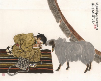 然而,相比外界看來更誘人的極地浮世繪,韓書力卻為人而著了迷。他住進村民家,男主人從雪山邊挑來冰碴子水,再用寶貝般的牛糞燒熱了,好讓客人洗手。瞧見牛糞的珍貴,韓書力一邊暗下心思“7天不洗臉”,一邊細細觀察婦女們撿牛糞餅的歡喜情形,揮筆畫就 《牛糞餅》。他與牧區(qū)的藏族漢子聊天,從未走出過阿里的藏家孩子提問:“書上說地球是圓的,可為什么佩枯措的水不會流出來?”佩枯措是村邊一汪內(nèi)陸湖,韓書力暗暗訝異于孩子的學(xué)識,一幅 《先寫作業(yè)》 應(yīng)運而生。他也曾問起過放羊的藏族同胞,知不知道這200多只羊在高原之外能賣多少價錢,對方答:“我們一家吃喝,我買賣20只羊足夠了,剩下的都是為老天而放牧的?!蹦撩駥μ斓刈匀坏木次氛鸷沉隧n書力,《小鳥》 一作,讓人渾不覺生活苦寒,反而多的是人與動物、自然相親、相通的和諧。