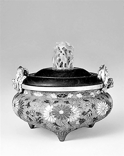 掐絲琺瑯即銅胎掐絲琺瑯,又稱“景泰藍(lán)”,其制作工藝是在金、銅胎上以金絲或銅絲掐出圖案,再填上各色琺瑯,最后通過焙燒、研磨和鍍金等多道工序完成。掐絲琺瑯菊花紋三足爐始見于明初,此爐造型脫胎于宣德銅爐,主題紋飾為纏枝菊花,菊花已花蕊舒展,盡情怒放,白、紅、黃、墨色相映成趣,菊花上方環(huán)繞著五彩如意云紋,纏枝菊花朵舒展飽滿,枝葉肥厚,并蒂排列。圖案布局疏朗,掐絲線條奔放有力。此爐琺瑯質(zhì)地細(xì)膩潔凈,釉面光亮,無論造型還是做工,均十分精美,是典型的明早期掐絲琺瑯作品。