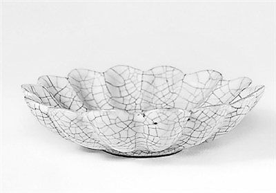 這件菊瓣盤由十四棱菊瓣并列組合而成,整體看上去像一朵盛開的菊花,造型簡潔優(yōu)雅。青灰色釉素裹,開片紋密如蛛網(wǎng),妙趣天成,堪稱古陶瓷模仿菊花造型的典范。