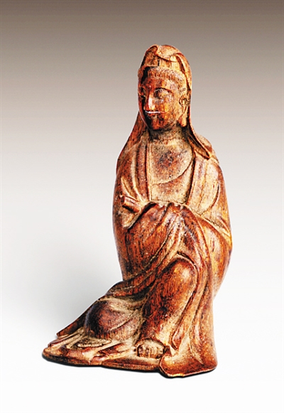 南北朝前后觀音菩薩的形象仍帶有印度觀音的特點,是男性的形象,有些早期觀音塑像可以明顯看到嘴上部的小胡子。從這件現(xiàn)代沉香木雕觀音像來看,是一為溫婉的女性形象,應(yīng)是唐代以后才出現(xiàn)的觀音造型。唐朝女性的地位有大幅度提高,武則天就曾被認為是彌勒佛的化身;同時女性觀音的慈悲形象也易于被民眾接受,這樣女性觀音在唐代開始出現(xiàn),自宋元以至明清,女性觀音形象就完全定型了。