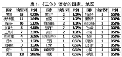 本文選取了前200條書評,獲得有效數(shù)據(jù)195條。從中發(fā)現(xiàn),這些讀者來自30多個國家和地區(qū)。其中美國讀者最多,達到52.82%, 其次是英國讀者為9.23%, 再次澳大利亞讀者為5.64%,西班牙讀者為5.12%。除傳統(tǒng)發(fā)達國家之外,一些發(fā)展中國家的讀者也在上面撰寫了自己的感想。如南非、巴西、印度、坦桑尼亞、科威特、克羅地亞、烏克蘭、烏拉圭、智利等國家的讀者,這些都是此前中國文學(xué)作品的反饋很少見到的。