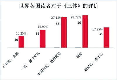 在作品風(fēng)格和故事情節(jié)的分析中,有27.18%的人明確提到了“中國科幻小說”,有28.72%的讀者認為“很好”,17.95%的讀者認為《三體》是“最好的”“杰出的”小說,三項合計為73.85%,恰好印證了2萬多讀者給《三體》打出4分、5分的人數(shù)比例??梢姟爸袊苹谩毙≌f、“非西方風(fēng)格”是《三體》贏得世界上這么多讀者青睞的主要原因。比如有個英國讀者寫到:“作為一個英語國家的讀者,我讀的大部分小說都是西方式的或者英語國家式的。這部小說讓我讀起來感覺很新鮮,人物不再是常見的美國式的、英國式的或者歐洲式的,也不是澳大利亞式的。讀劉慈欣的書,既是閱讀一部包含中國歷史文化的科幻小說,也是閱讀一部不以英語國家和說英語的人物為中心的小說?!庇忻绹x者寫道:“沒有讓我失望,與我讀過的科幻小說很不一樣,期待閱讀下一部?!薄拔液芟矚g這部小說,它充滿了令人驚喜的科學(xué)概念,此外小說中的觀點是非西方式的?!?/p>