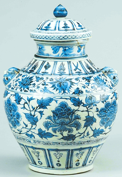 專家還介紹,元朝時,中國與中東地區(qū)貿易往來頻繁,中東從中國訂制了大量青花瓷,而燒造青花瓷所用的鈷藍料則從中東地區(qū)進口。這類進口的“蘇麻尼”青料含鐵量高、含錳量低,成色濃艷青翠,料厚處自然形成內凹狀的黑鐵斑,黑鐵斑和濃艷的青藍色相映成趣。而這件元青花纏枝牡丹紋獸耳蓋罐的花紋,也有很多黑點,這正是高鐵滲出來的,就連器物上的很多花葉也出現(xiàn)了這種狀況。這些也非常符合元青花的特征。綜合各種分析,專家斷定這件器物是元代青花瓷。