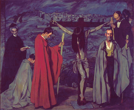 對于畫家來說,對于看到這幅畫的外國人來說,這就是西班牙的土地和屬于這片土地的人。丹納曾在他的《藝術(shù)哲學(xué)》中寫道:“西班牙畫家給你們看到的是他們的種族的典型,又是瘦削,又是神經(jīng)質(zhì),結(jié)實(shí)的肌肉受著山上的北風(fēng)吹打和太陽的熏炙格外堅(jiān)硬,性情頑固、倔強(qiáng),壓制的情欲老是在沸騰,內(nèi)心的火燒得滾熱,憂郁,嚴(yán)酷,受著煎熬;深色的衣服和畫面上焦黑的色調(diào)對比強(qiáng)烈?!薄堆健氛宫F(xiàn)的正是這樣的人物形象。陪伴受難基督的這幾個(gè)西班牙人,不是有名有姓的人,而是民族的群像,也就是說,他們是“類型”,是畫家從他對本國民眾的觀察中提取出的藝術(shù)形象,是風(fēng)格化了的西班牙人。他們與他們身后的原野與城市共同構(gòu)成西班牙的風(fēng)景。這陰郁、悲愴、具有濃厚中世紀(jì)色彩的風(fēng)景,也是同時(shí)代的西班牙詩人與散文作家所凝視、描繪和贊嘆的風(fēng)景。阿索林在一篇散文中寫道:“我看見虔敬之心在我們的西班牙所常臨的一切地方。我們的整個(gè)靈魂,我們的民族的整個(gè)堅(jiān)實(shí)的心靈,不就是在那些教堂中,在那些基督受難十字架中,在那些苦修庵中,在那些修道院中,在那干燥的天空中,在那平碩的平原中嗎?”如果說我們常在旅游廣告中所見的地中海景致的西班牙是一個(gè)表層的、膚淺的西班牙的話,那么這個(gè)內(nèi)陸的、山野的西班牙則是深沉的西班牙。