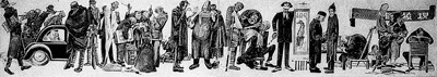就現(xiàn)實戰(zhàn)斗性和社會震撼力而言,丁聰在抗戰(zhàn)時期和內戰(zhàn)時期的政治諷刺畫,無疑最為突出,也最能反映出他的銳氣。一幅《現(xiàn)象圖》長卷,形象勾畫出抗戰(zhàn)后期的政府腐敗和社會慘狀。貪官、傷兵、淑女、官商、窮教授、沽名釣譽的畫家……形形色色的人物,構成了現(xiàn)實生活真實的畫面。三年后創(chuàng)作的另一長卷《現(xiàn)實圖》成為《現(xiàn)象圖》的延續(xù)。內戰(zhàn)風云中大發(fā)戰(zhàn)爭財?shù)闹型馍倘?、饑餓中的窮人、被迫上陣的炮灰……在丁聰?shù)墓P下,不同身份的人物排列一起,便成了那個時代的縮影。
