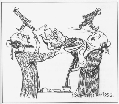 丁聰是多面手,但他畫得最多的還是漫畫?!奥嫛币辉~,從西方引進,包含著諷刺、幽默、世態(tài)、笑話等多種畫體,丁聰都有涉及,但在丁聰筆下最為犀利也最為杰出的是社會諷刺畫。