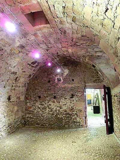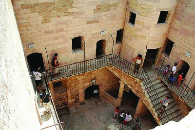 三個(gè)碉樓之間那片房舍,大致呈方形,每邊長約二十八米??邕^木制吊橋,通過一個(gè)低矮的小石門,就走進(jìn)城堡的內(nèi)部。整個(gè)建筑的中心是一個(gè)陡然壁立的小天井,周遭是兩層的小樓房。樓房的每層都是一個(gè)個(gè)安裝著鐵柵欄的黑洞,黑洞里面是一個(gè)個(gè)石頭壘建的小房間。房間原是駐軍的營房,后改為關(guān)押犯人的囚室。囚室有五十多間,用阿拉伯?dāng)?shù)字編號(hào)。透過鐵柵門可以看到,囚室大小不一,墻壁上均開有一個(gè)小洞作窗戶。一縷光線從小洞照射進(jìn)來,反襯得室內(nèi)更加幽暗。據(jù)介紹,當(dāng)年,囚犯根據(jù)不同的出身和貧富,在這里受到不同的待遇。出身低微和貧窮者,被關(guān)押在狹小而陰暗的囚室;出身高貴和富有者,則被關(guān)押在較為寬敞的囚室,不但有較大的窗戶通風(fēng),還有壁爐取暖。