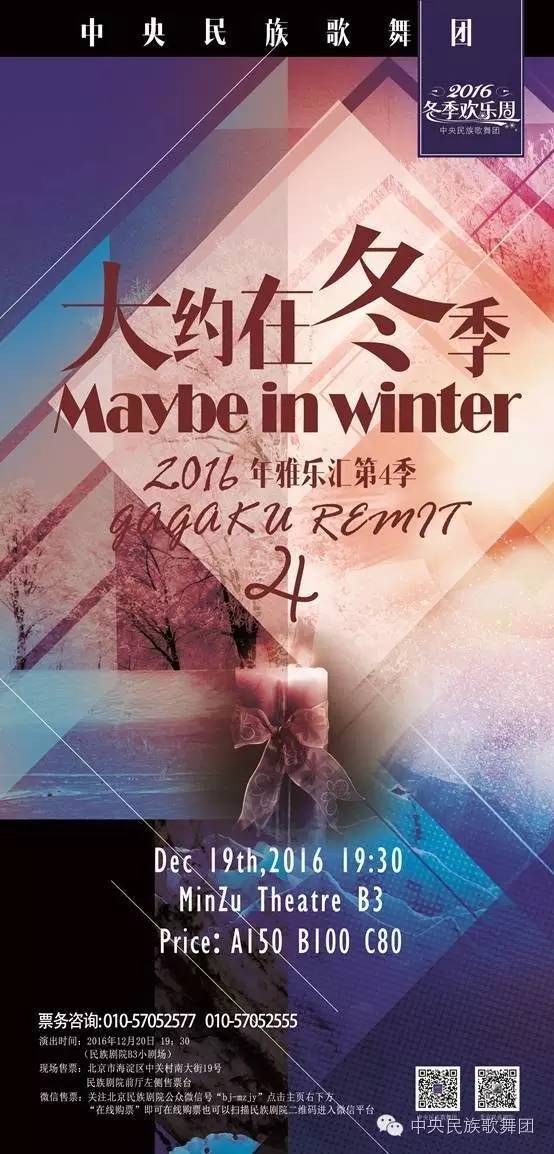 《2016年雅樂(lè)匯第四季—大約在冬季》將于12月19日在民族劇院B3小劇場(chǎng)帶來(lái)一場(chǎng)充滿溫情的音樂(lè)會(huì),給觀眾帶來(lái)冬天音樂(lè)的別樣感受。