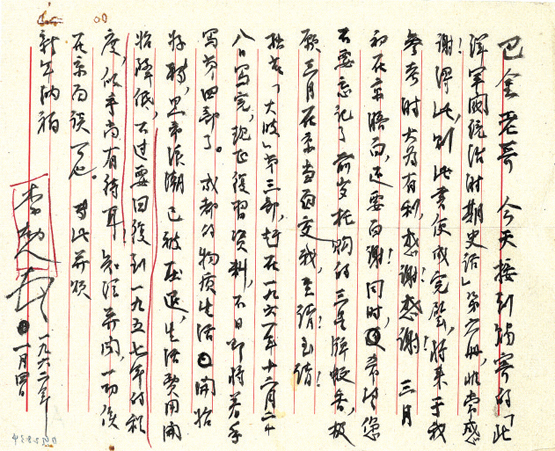 珍藏于中國現(xiàn)代文學館的書信中,有兩封是李劼人寫給巴金的,內(nèi)容篇幅均不長,但是信息量很多,折射出李劼人1958年3月初和1962年1月底的生活和創(chuàng)作情況,并談及友情、健康和物價水平等,該史料具有珍貴的研究價值。