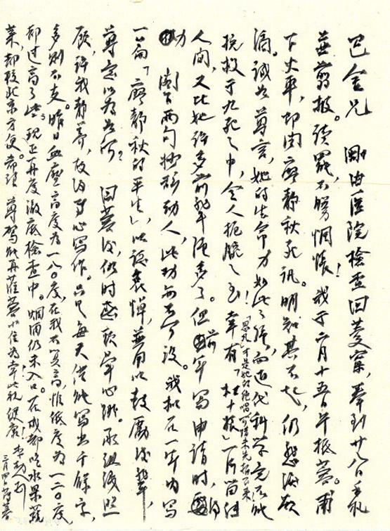 回蓉后,仍時感厥暈心跳。承組織照顧,許我靜養(yǎng),故得專心寫作。只是每天僅能寫出千余字,多則不支。昨日血壓高度為一八〇度,在我不算高,惟低度為一二〇度,都過高了些?,F(xiàn)在再度澈底(徹底)檢查中。煙酒仍未入口。在成都吃水果蔬菜都較北京方便。希望尊駕能再蒞蓉小住為幸!此祝健康!