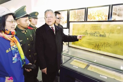 “陸軍工兵大佐高橋勝馬”“昭和八年秋于廟行鎮(zhèn)寫之”……在這幅《申江戰(zhàn)焰圖》左下方,一行中文記錄下畫作的作者和時間。據捐贈者葉永烈介紹,這幅畫作是他父親收藏多年的藏品,始終掛在家中客廳最顯眼的位置?!斑@幅由日本軍官親筆所繪的日軍侵滬所造成的慘象,記錄了一段特殊的歷史。父親始終將其掛在家中,就是希望我們記住過去那段歷史,以史鑒今,莫忘‘窮兵黷武總是空’?!?/p>