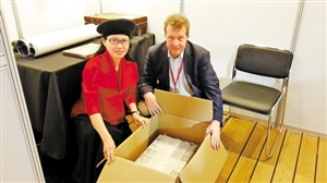 本屆古書展顧問鐘芳玲與麥格斯兄弟古書店負責(zé)人在打包《賽勝獵報》。