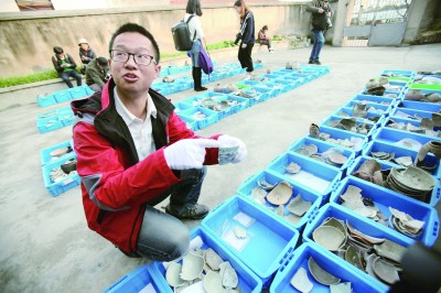 考古工作人員向記者展示出土文物。青年報(bào)記者 吳愷 攝