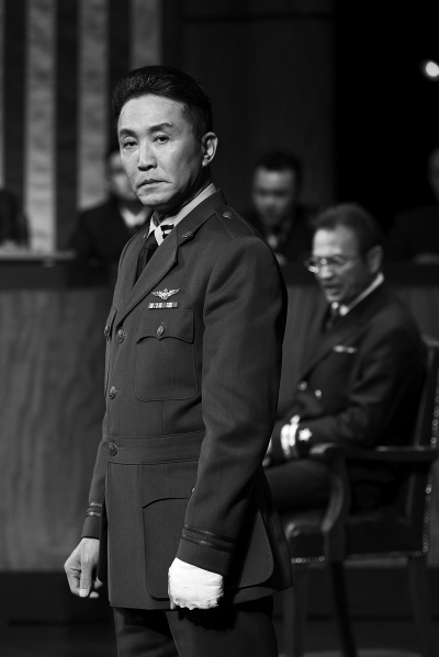 劇場里,開場鐘早已敲過三遍,格林渥穿著硬朗帥氣的軍人制服站在舞臺上,發(fā)絲根根锃亮,兩側剃得極短,帶著烏青。他巧舌如簧,質(zhì)疑著每一個企圖為原告作證的人,他是被告的律師,卻以狡黠的詭辯取得了最終勝利;而走出法庭后,他才說出了潛藏內(nèi)心的真實想法。