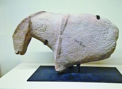 在“人形石碑”單元,我們可以看到有著一百多萬年歷史的石制生產(chǎn)工具,包括石斧、刮削器、箭鏃等,向人們訴說百萬年前阿拉伯人祖先的艱辛與智慧。展柜里有一件石馬,只殘存著頭部和軀干。然而,可別小看這個貌不驚人的石馬,它可是距今一萬年前的石雕。它從鼻子至肩部的脊狀有著明顯的刻畫,沙特的專家說,這些刻畫很可能代表著早期的韁繩。也就是說,在那個時期,沙特地區(qū)的人們可能已經(jīng)擁有了馴化馬的技術。而在此之前,人們多認為馬的馴養(yǎng)最早發(fā)生在公元前3500年的中亞地區(qū)。