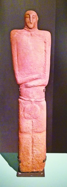 距今6000年的人形石碑是阿拉伯半島迄今發(fā)現(xiàn)的最早最著名的古代人類遺物。展廳中的三件石碑雕像雖然來自半島的不同地區(qū),但人物造型具有顯著的相似性:整體長方,上身較方,鎖骨高聳,雙臂交叉,整體造型風格顯著,具有強烈的表現(xiàn)力。三尊雕像在衣著、神態(tài)風格上迥異,或許代表著古代阿拉伯半島不同村落和部族之間存在的風俗差異。