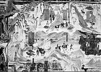 色彩繪畫逐漸衰落并失去中心地位,水墨繪畫不斷發(fā)展壯大并成為主流,這是一個(gè)漫長的變化過程。山水畫中天空水面由施染色彩到不施色彩,反映了時(shí)代審美風(fēng)尚的轉(zhuǎn)變。李白《觀博平王志安少府山水粉圖》一詩作于天寶三年(744年),敦煌莫高窟第217窟建于景龍年間(707—710年),是敦煌望族陰氏家族所建的功德窟。李白所見的那幅天空不設(shè)色的山水畫、敦煌莫高窟的南壁經(jīng)變畫面,在色彩繪畫盛行的當(dāng)時(shí)非常罕見、別具一格,為山水畫發(fā)展中的水墨之變提供了佐證,說明在初盛唐時(shí)期,水墨繪畫已經(jīng)開始滋長,水墨之變已經(jīng)漸露端倪。