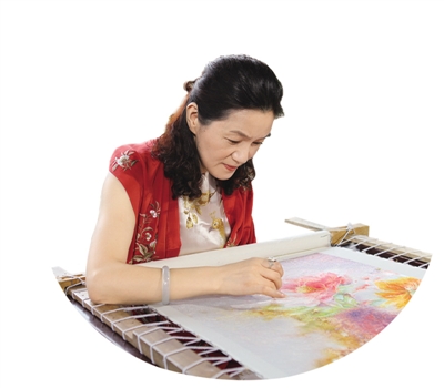 圖①:姚建萍在進(jìn)行刺繡創(chuàng)作。