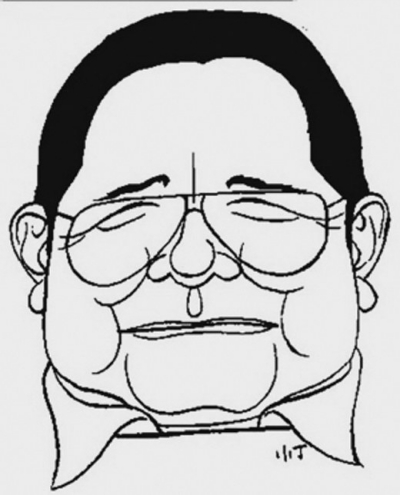 這部“肖像集”中的大多數(shù)圖,由于簡潔生動,已在報刊上多處引用,所以很多讀者都曾見到。不過其中與畫相配“寫”的內(nèi)容,人們也許了解略少。譬如曾任三聯(lián)書店老總的范用對自己的漫畫肖像說:“我很丑,也不溫柔。一本正經(jīng),鬼都不相信。謹(jǐn)防上當(dāng),不要跟著感覺走。十足糊涂蟲,左右拎勿清。曾經(jīng)深愛過,曾經(jīng)無奈過。誰能告訴我,什么是什么?!边@其中的滋味,人過中年也許都不難體會;著名漫畫家華君武面對自己的肖像漫畫自述:“我屬兔,1915年生,大概在1992年,請人刻了一塊閑章‘大愚若智’,也用在某些漫畫上,實際上也是對我?guī)资旯ぷ鞯目偨Y(jié)?!碧热羯陨苑词。按笥奕糁恰辈皇俏覀兩嬷谐R姷挠腥と松F(xiàn)象嗎?