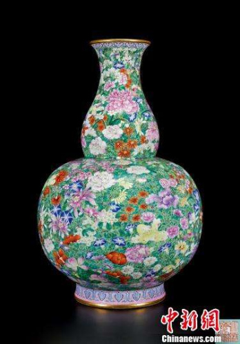 乾隆洋彩萬花獻瑞圖大吉瓶。拍賣公司供圖