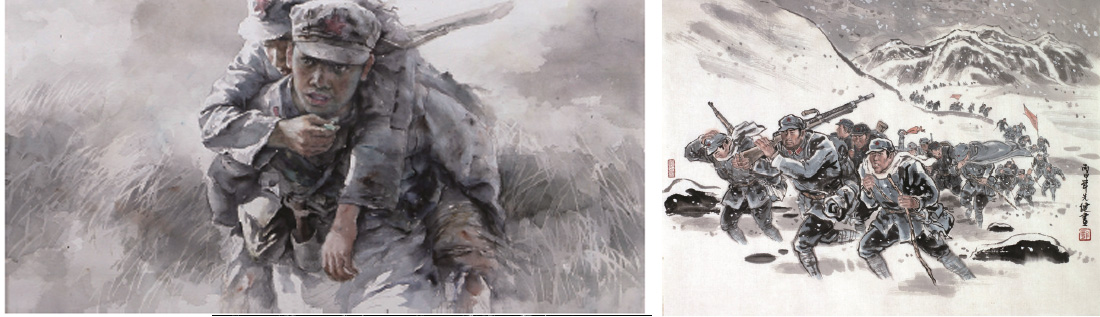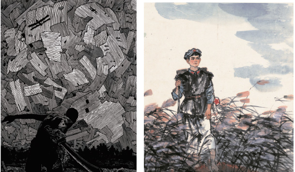 表現(xiàn)形式的自由和文學(xué)性的敘事方式是連環(huán)畫(huà)的特質(zhì)與優(yōu)勢(shì)。入選作品中既有《走過(guò)長(zhǎng)征的過(guò)山炮》(白潤(rùn)祥)那樣的筆意酣暢剛勁、氣勢(shì)磅礴的宏大敘事,也不乏《紅軍長(zhǎng)征故事——女紅軍故事》(唐鼎華)一類(lèi)的輕松靈動(dòng)、活潑精巧的感人故事;既有《長(zhǎng)征——理想與信念的詩(shī)篇》(張曉東)利用傳統(tǒng)畫(huà)種的天然屬性創(chuàng)造的精神圖式,也有《第一騎兵師》(鄭萬(wàn)林)融會(huì)貫通了外來(lái)藝術(shù)的個(gè)性化表達(dá)。畫(huà)家們以富于時(shí)代氣息的藝術(shù)語(yǔ)言和表現(xiàn)方式,豐富和深化了連環(huán)畫(huà)文學(xué)性的內(nèi)涵。