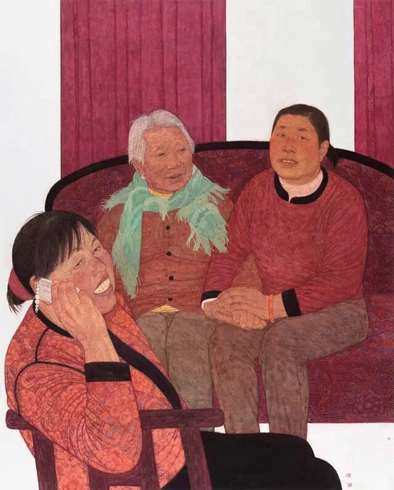 其中,給人印象深刻的當屬“向人民匯報——20位中青年美術家深扎作品展”,此展是繼2015年舉辦“當代15位美術家深扎作品展”之后,著眼于呈現當代中青年美術家深扎主題實踐的展覽。此展不僅在年齡選擇上以“70后”、“80后”畫家為主,而且出展作品都是這些畫家長期深入他們鐘情的某一生活基地而不斷積累、長期沉淀的作品。譬如,持續(xù)關注城市農民工生存狀態(tài)的李傳真,此次回到了她曾下放過的湖北三湖農場,創(chuàng)作了《放學》《暖陽》和《婆·媳》等工筆畫,作品著重刻畫了那些鄉(xiāng)親們明朗、歡愉、自足的精神面貌與生活情態(tài)。這種具有生活溫度的畫作,還使得工筆人物畫在深化寫實程度的同時,也深刻體現了從西式寫實再度向東方寫意回歸的藝術探索。作為蒙古族畫家,鮑風林在采風寫生基礎上創(chuàng)作的《長調草原》,從現代文明的視角發(fā)掘了游牧民族原生的文化形態(tài),畫作通過對草原長調歌詠的表現,展現了寬廣恢弘的民族史詩,水墨基調也由此顯得蒼茫凝重。應當說,深扎主題實踐,讓許多中青年美術家找到了藝術創(chuàng)作與藝術創(chuàng)新的根脈。一方面,他們從人民深厚的生活土壤里發(fā)掘出普通人的精神境界,并在清新藝術語言的開拓中最大限度地表達了人民的思想情感;另一方面,他們從全球化視野和現代文明角度對于中國傳統(tǒng)文化的再發(fā)現,也在很大程度上影響了他們藝術探索的路向,從而更加堅定了他們從本土的現代境遇中探尋自主發(fā)展道路的信心。