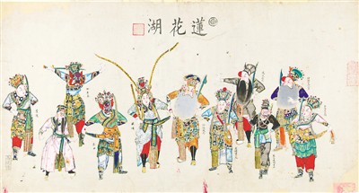 此外,還有一些作品屬于年畫畫師“點套”的粉本,即印出墨線版后,畫師直接在上面手工填色,刻工再據(jù)此分別刻出各塊色版。這類粉本過去在年畫作坊內(nèi)秘而不傳,今朝得見,也是非常難得。這次展覽中的《雅觀樓》《逍遙津》《雁門摘印》《捉放曹》《年年太平》等,就屬于粉本中的精品。