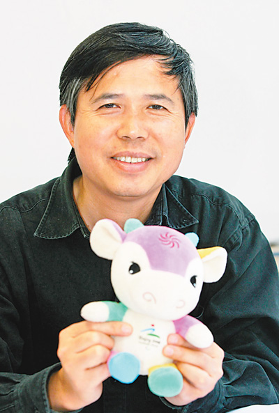 吳冠英和他設計的2008年北京殘奧會吉祥物“福?!?。 資料圖片