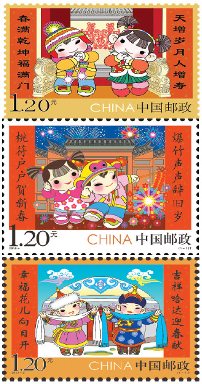 吳冠英設計的2015年、2016年、2017年《拜年》郵票。 資料圖片