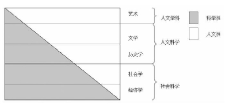 其中經(jīng)濟(jì)學(xué)是一極,其理性成分最重,而人文性最弱;另一極——藝術(shù),其人文性最強(qiáng),而科學(xué)與理性成分最弱,從經(jīng)濟(jì)學(xué)、社會學(xué)、歷史學(xué)、文學(xué)到藝術(shù),理性或科學(xué)性遞減,人文性遞增。當(dāng)然,嚴(yán)格地說,最富藝術(shù)性的音樂,也含有理性,瑪麗婭娜·韋伯為馬克斯·韋伯《經(jīng)濟(jì)與社會》所寫的前言中曾指出,“理性也在并且恰恰在音樂——這個似乎是最純粹淵源于感情的藝術(shù)——里,起著一種至關(guān)重要的作用” 。藝術(shù)以下諸學(xué)科,皆以“學(xué)”命名,其中經(jīng)濟(jì)學(xué)、社會學(xué)可以稱為社會科學(xué),歷史學(xué)、文學(xué)可以稱為人文科學(xué),而藝術(shù),就不以“科學(xué)”稱之,而是人文“學(xué)科” 。比如音樂,盡管也有樂章、旋律、節(jié)奏、節(jié)拍等理性規(guī)范,但它卻是“最純粹淵源于感情的藝術(shù)” ,不能以科學(xué)名之。