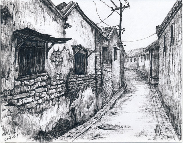 奚耀華說:“我畫胡同原本起于一種偶然,平時愛逛胡同,有胡同情節(jié),于是拍了不少舊胡同的照片,日常辦公閑暇之時,便打開電腦,用辦公用的中性筆和便簽紙隨意描繪。漸漸地便有了一些感覺,對中性筆的筆性也逐漸掌握,于是一發(fā)而不可收拾。可以說沒有哪個畫家是專用中性筆作為繪畫工具的。我之所以一直沿用至今,一是因為自己并非專業(yè),所用工具隨手拈來,信馬由韁;二是基于作品完成后的效果,與我理想的感覺很是接近,于是也不再想有所更換。中性筆兼有鋼筆的銳度和鉛筆的柔和,運用得當(dāng),對于描繪舊胡同的滄桑感,有獨到的筆意?;蛟S,這也可以成為我繪畫創(chuàng)作的一個特點?!保ㄐ〕蹋?/p>