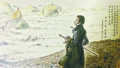 高莽畫了不止一幅普希金在長城的畫作,有的明媚、有的陰沉,有的年輕、有的蒼老,他最喜歡的還是印在明信片上的這張,高莽想象中的普希金站在長城上望著遠(yuǎn)方,風(fēng)吹動他的衣襟飄起?!捌障=鹨恢毕雭碇袊匆豢矗敬蛩愀翈焾F(tuán)一起來的,結(jié)果沙皇不讓,直到去世也沒能實(shí)現(xiàn),我想用自己的畫替他實(shí)現(xiàn)這個愿望?!备呙дf,“我一直在想,他的作品全部都翻譯成中文了,不僅僅是詩歌,還有回憶錄、日記甚至?xí)?,我們把他的作品翻譯完了,但他的愿望卻沒人知道,比如來中國?!?/p>