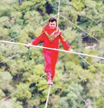 阿迪力也一直身體力行,積極弘揚(yáng)少數(shù)民族地區(qū)優(yōu)秀的傳統(tǒng)文化。他5歲時父親去世,留下遺囑說不許孩子學(xué)習(xí)達(dá)瓦孜。后來阿迪力自己練習(xí),并加入了父親當(dāng)年所在的英吉沙縣雜技團(tuán)。一次演出中,主繩突然斷裂,阿迪力高空摔下造成身體17處骨折,醫(yī)生說可能永遠(yuǎn)無法站立,那時候,阿迪力才想起父親的遺言,不讓孩子學(xué)習(xí)達(dá)瓦孜,也許是因?yàn)閷?shí)在是太危險了。因?yàn)閷_(dá)瓦孜的熱愛,他又重新站到了舞臺上。而更多的人知道阿迪力,大概緣于十幾年前那次他高空走繩索橫跨長江三峽。當(dāng)時他在電視上看到美籍加拿大人科克倫準(zhǔn)備橫跨三峽,挑戰(zhàn)世界紀(jì)錄,心里很不是滋味:“三峽是中國的三峽,中國那么多人,讓外國人打破紀(jì)錄,豈有此理! ”阿迪力決定向科克倫挑戰(zhàn),他通過演出和發(fā)動群眾捐款籌措資金購買鋼絲繩, 1997年6月22日正式挑戰(zhàn)跨越三峽,以13分48秒的成績刷新了科克倫53分10秒的紀(jì)錄。這是他第一次打破世界紀(jì)錄,也將達(dá)瓦孜的名字傳遍中國,傳到世界。此后,阿迪力又接連打破多項世界紀(jì)錄,還曾在國家體育場“鳥巢”創(chuàng)造了“連續(xù)60天累計走鋼絲時間之最” ,借此弘揚(yáng)達(dá)瓦孜藝術(shù)。去年“2016阿迪力高空挑戰(zhàn)極限之旅” ,他沿絲綢之路經(jīng)濟(jì)帶,行程上萬里,為各民族文化交融搭建平臺,架起了絲綢之路友誼的橋梁。