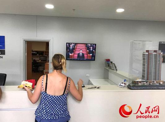 澳大利亞昆士蘭州一棟公寓進(jìn)門大堂處,墻上的電視正在直播全國政協(xié)十二屆五次會議開幕式。