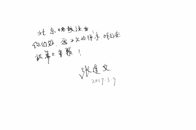 今年是雞年也是張連文的本命年,雖然老人現(xiàn)在行動不太方便,但他依然對表演事業(yè)充滿了熱情,在采訪的最后,他用左手顫抖著為《北京晚報》的讀者寫下這段話:愿不久的將來,我們在銀幕上重聚!