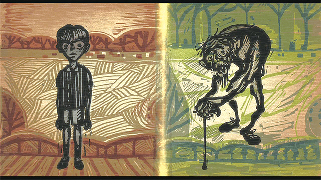 細(xì)細(xì)看來,這部短片的很多情節(jié)是令人匪夷所思的。譬如,表現(xiàn)維莎眼中那個(gè)向她求愛的男人時(shí),影片以獨(dú)白的方式交代了她自言自語的過程。右眼望著那個(gè)拄著拐杖的老頭子,維莎對自己說:“哦,我的天啊,他聞起來就像爛泥?!比欢?,這分明是嗅覺的信息——如果維莎僅僅是眼睛有問題,不應(yīng)該能聞得到老人身上的氣味。當(dāng)然另一種可能是男人正在一灘臭水溝邊向維莎表白,但這又不太現(xiàn)實(shí)……還有,當(dāng)維莎望著窗外時(shí),左側(cè)畫面中出現(xiàn)了她的手,手指修長,看上去是青年女性的手;可窗外的樹那時(shí)候還很矮小,影片暗示這是維莎左眼看到的很多年前的畫面?;蛟S如若出現(xiàn)的是一只孩童的小手,這畫面會(huì)更具可信感。但瑕不掩瑜,這部影片憑借著一個(gè)基礎(chǔ)性的背景設(shè)定,已足以成為一部極具魅力的作品。