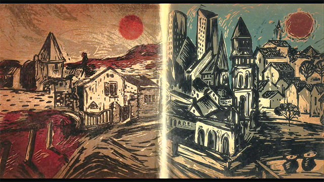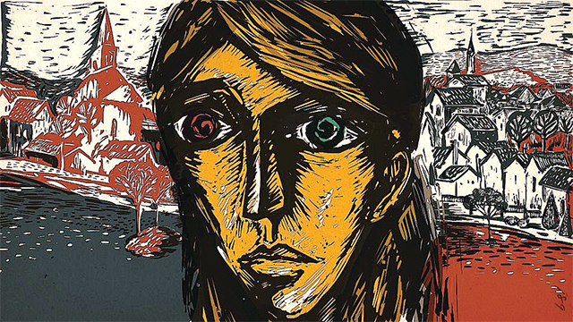 《盲眼維莎》的故事說起來簡單,卻有著非常獨(dú)特且引人遐想的設(shè)定:在一個(gè)小山村里,有個(gè)名叫維莎的美麗女孩。她從剛出生,視覺功能就與其他人不一樣:她的左眼只能看到過去,而右眼則只能看到未來——是的,維莎惟獨(dú)無法看到現(xiàn)在。她雙眼的顏色也不同,一只紅褐色,一只綠色。影片使用了分屏的形式來進(jìn)行表達(dá),把畫面用一道淺色的豎線一分為二,展現(xiàn)維莎的奇特主觀視角——左側(cè)是紅色調(diào)的過去圖景,右側(cè)展現(xiàn)綠色調(diào)的未來。雖然她確實(shí)能看到東西,卻與其他感知極度分裂,因此村子里的人們都叫她“維莎,那個(gè)盲人女孩”。