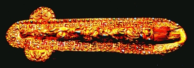 ①蒂拉丘地出土的“雙龍”圖案黃金劍鞘。本報(bào)記者 李韻攝/光明圖片