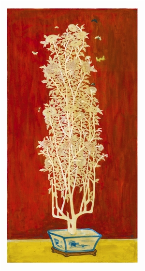 靜物則是常玉運(yùn)用東方美學(xué)與西方素材之最佳典范,史博館共有靜物27件。常玉愛畫盆景,以不合比例的小花盆、具有個人符號意味的鹿角枝,撐起中國色彩的牡丹、菊花、玫瑰、果實(shí)和雀鳥等,有著西方圣誕樹的熱鬧堆疊,繁盛中卻不無落寞之意,不免令人將其不順?biāo)斓娜松c八大山人相比擬。也讓人想起吳冠中評價(jià)他的話:“常玉畫了那么多盆景,盆景里開出綺麗的繁花,生意盎然;盆景里茍延著凋零的殘枝,凄凄切切,卻鋒芒畢露……我覺得常玉自己就是盆景,巴黎花園里的東方盆景……”