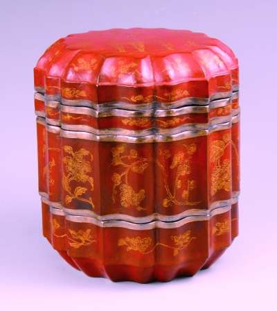 朱漆戧金蓮瓣式人物花卉紋漆奩