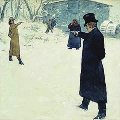 1837年2月8日,俄歷1月27日,彼得堡郊外寒風(fēng)刺骨,冰雪覆蓋著黑河。下午5點(diǎn),肅殺清冷的雪地上,出現(xiàn)了兩個(gè)手握左輪槍的決斗者———詩人普希金和皇家禁衛(wèi)軍龍騎兵中尉丹特士。天空陰沉,氣氛肅殺,助手將上了子彈的手槍交到兩人的手中。按照決斗的規(guī)則,相背的雙方在開始信號(hào)發(fā)出后,同時(shí)轉(zhuǎn)身向界線處跑去,先到者先開槍。丹特士眼見普希金比他快捷一步,情急中居然不顧規(guī)則搶先開了槍……子彈打中了普希金右腹,倒下的普希金努力撐起身子,瞄準(zhǔn)丹特士,扣動(dòng)扳機(jī)。丹特士應(yīng)聲倒下,聲稱打中了胸部。事實(shí)上,他在普希金開槍時(shí)已經(jīng)側(cè)身用手護(hù)胸,子彈只是擦著他的手。兩天后,重傷的普希金撒手人寰。
