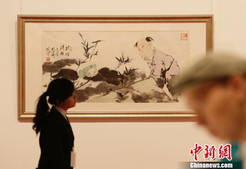 資料圖:范曾作品《荷塘清趣》亮相世界華僑華人美術(shù)書法展。中新社發(fā) 李慧思 攝