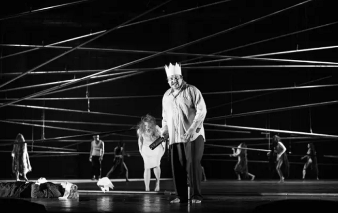 斜橫交錯(cuò)的線條,空的舞臺(tái),水,水桶,也許是皇家宴席中的瓶子,刀,還有紙作的王冠,凡此種種,重新定義了《麥克白》里的世界。