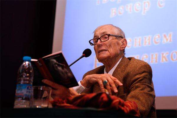 11月16日,在首師大為葉夫圖申科舉辦的詩歌電影晚會上,我這樣介紹葉夫圖申科:“他或許是所有健在的俄語詩人中最具世界性影響的人,作為‘響派’詩歌最突出的代表,他和他的詩歌在上個世紀(jì)六七十年代風(fēng)靡全蘇聯(lián),享有當(dāng)今的歌壇天王天后們才享有的名頭,他在盧日尼基體育場的朗誦會有數(shù)萬聽眾,他站在敞篷汽車上朗誦,成千上萬的人向他歡呼,向他致敬;他到過世界上91個國家,他的詩被翻譯成數(shù)十種文字,他在俄羅斯被視為‘活著的經(jīng)典’,‘俄語詩歌的大使’;其次,他或許是當(dāng)代俄語詩人中與中國淵源最深的人,早在1985年他就訪問了中國,是在改革開放后最早訪問中國的蘇聯(lián)作家之一,他在國際俱樂部的朗誦,他與中國詩人的見面,都在當(dāng)時的中國詩歌界、乃至文學(xué)文化界產(chǎn)生巨大影響,掀起了一場‘葉夫圖申科熱’?!薄叭~夫圖申科先生有一句名言:‘詩人在俄羅斯大于詩人?!约壕褪沁@句話的范例,從廣義上說,他不僅是一位詩人,也是一位文化活動家,社會活動家,是20世紀(jì)下半期俄蘇政治文化史中的一個歷史人物;從狹義上說,他不僅是一位詩人,也是一位電影導(dǎo)演、演員、小說家、評論家、翻譯家、攝影家等等。”晚會上,葉夫圖申科在詩歌朗誦環(huán)節(jié)之后又親自為我們講解他執(zhí)導(dǎo)的影片《幼兒園》。