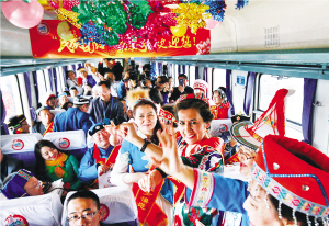 新疆56個(gè)民族代表同乘“民族團(tuán)結(jié)一家親號”列車,車廂似歡樂的海洋。吳卓勝 攝